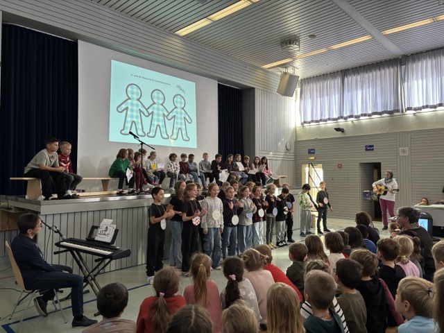 Alle Klassen kamen in der Festhalle zusammen. Die Klassensprecher begrüßten alle Schüler und erklärten, dass an unserer Schule alle Kinder willkommen sind. Passend dazu trug die Klasse 2b das Gedicht: „Ich bin ich“ vor und die Klasse 4c sang das Lied „Im Land der Blaukarierten“.
