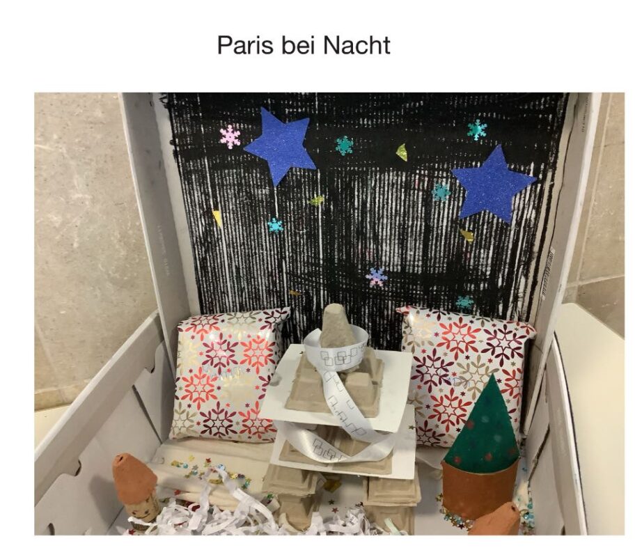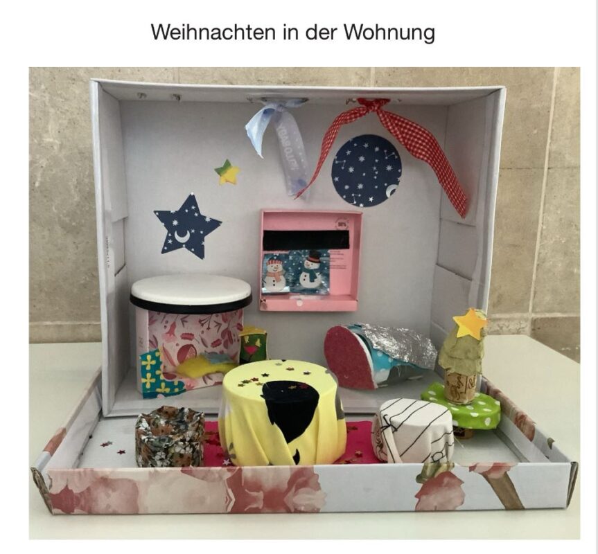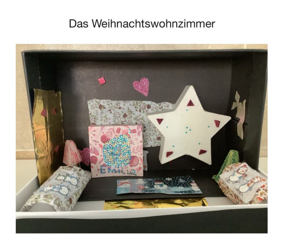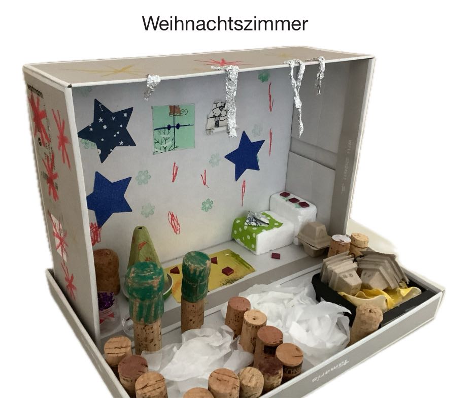 So wurden aus alten Schuhkartons durch Materialien wie Korken, Geschenkpapierresten, Küchenrollen, Verpackungsmaterial, Stempeln, Glitzersteinchen, Stoffresten u.v.m. kleine Kunstwerke.