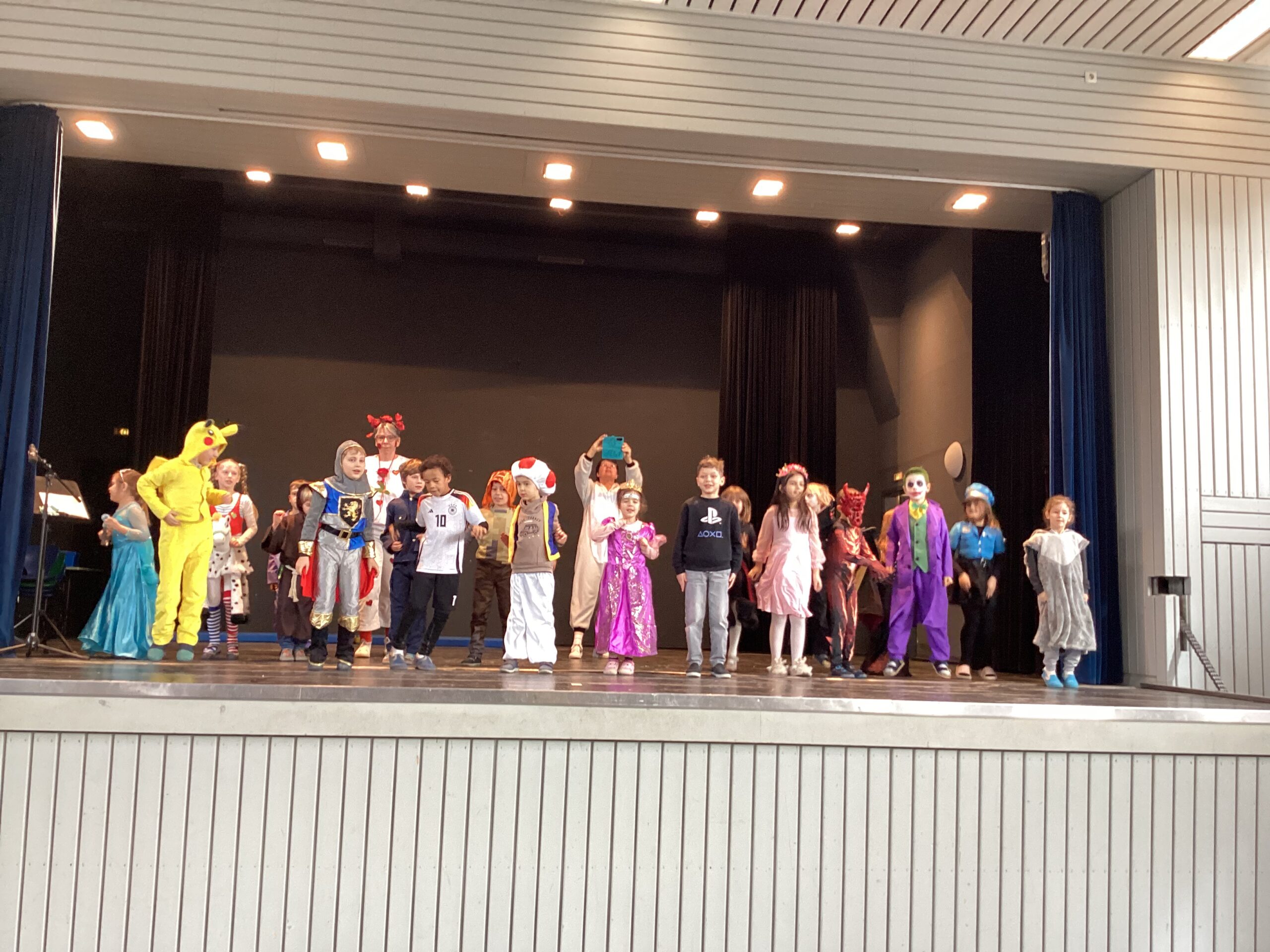 Mit einem donnernden „Narri, Narro“ und dem energiegeladenen Schlachtruf „Zickezacke, Zickezacke, hoi, hoi, hoi“ heizte unsere Schulleiterin Frau Altmann die Stimmung ordentlich an: Unsere diesjährige Faschingsfeier war ein voller Erfolg! Das Schulhaus verwandelte sich in eine kreative Fantasiewelt, in der die Kinder wunderbar verkleidet und geschminkt waren. Es tummelten sich stolze Prinzessinnen, gefährliche Piraten, lustige Clowns, prächtige Tierwesen und viele weitere Figuren durch die Gänge.